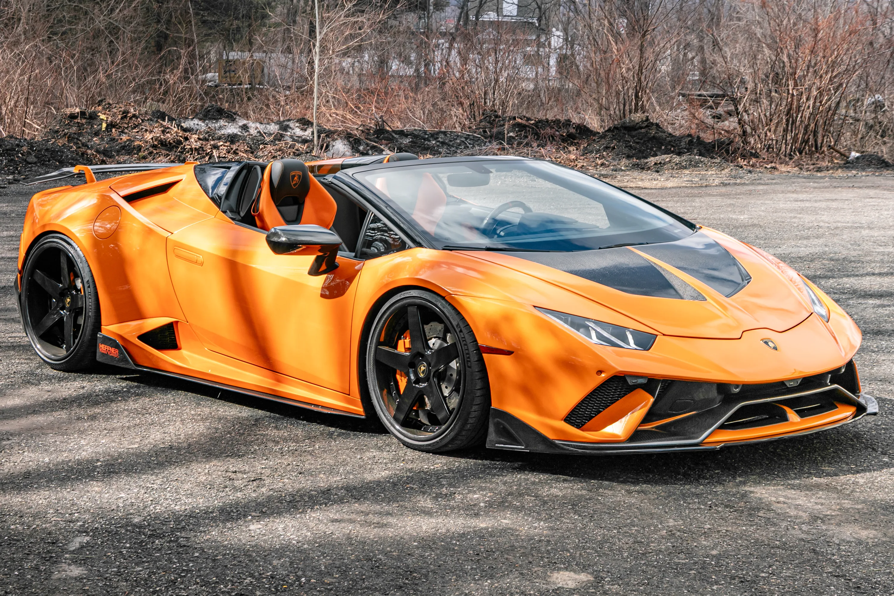 This Huracán has been upgraded with performance enhancements like a Heffner Performance twin-turbocharger system, Novitec lowering springs, and carbon fiber aerodynamic equipment from TOP END Motorsports. The car’s 800-horsepower V10 yields an intoxicating note, especially with the roof down and the aftermarket exhaust system making music. Finally, a SmartTOP roof-control module makes the car even more versatile in convenience and function.